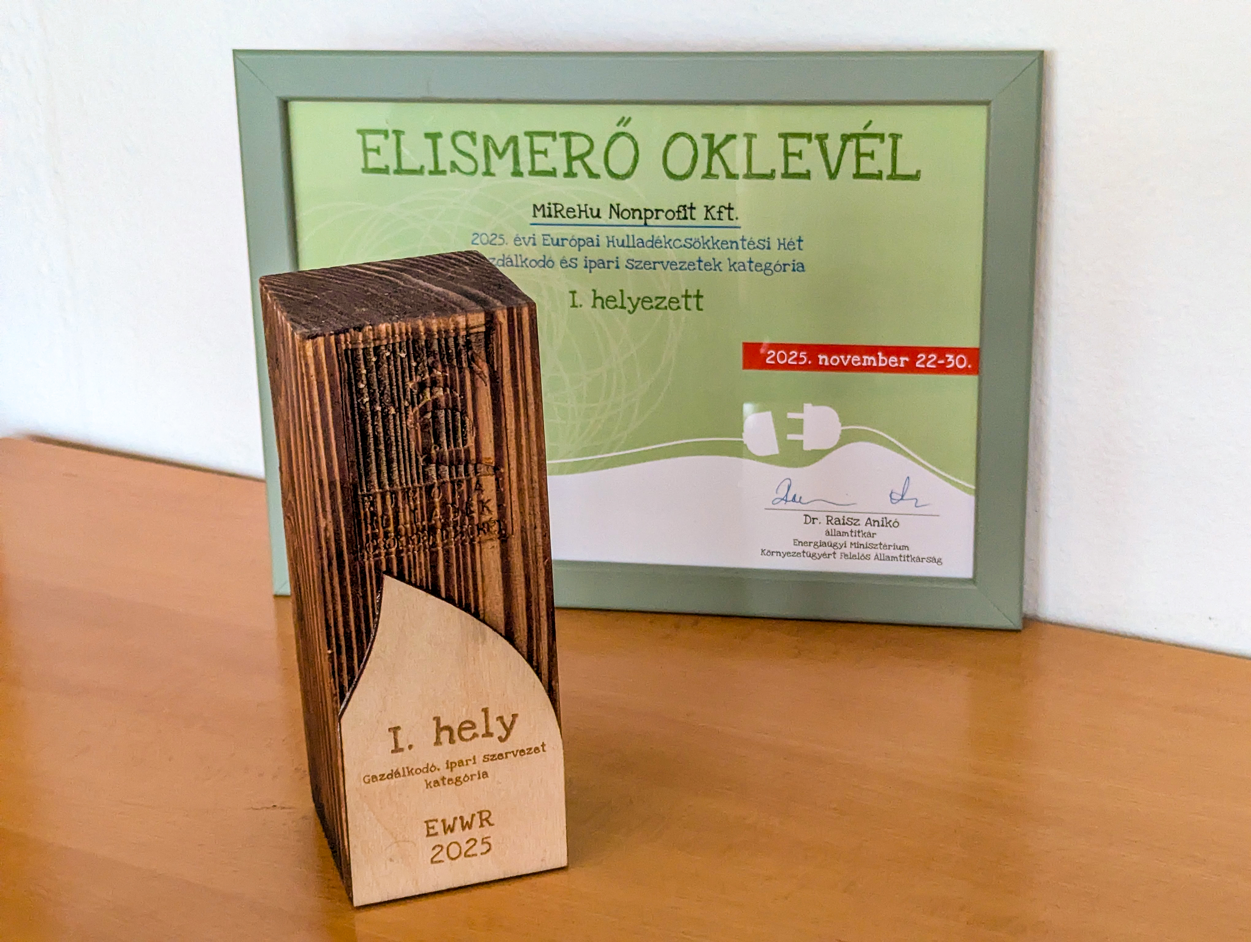 Nagy örömmel tudatjuk, hogy a 17. alkalommal megrendezésre került Európai Hulladékcsökkentési Hét hazai versenyének első helyét Társaságunk nyerte Gazdálkodó, ipari szervezet kategóriában, a zsűri a nemzetközi versenyre jelölésre is méltónak találta programunk.